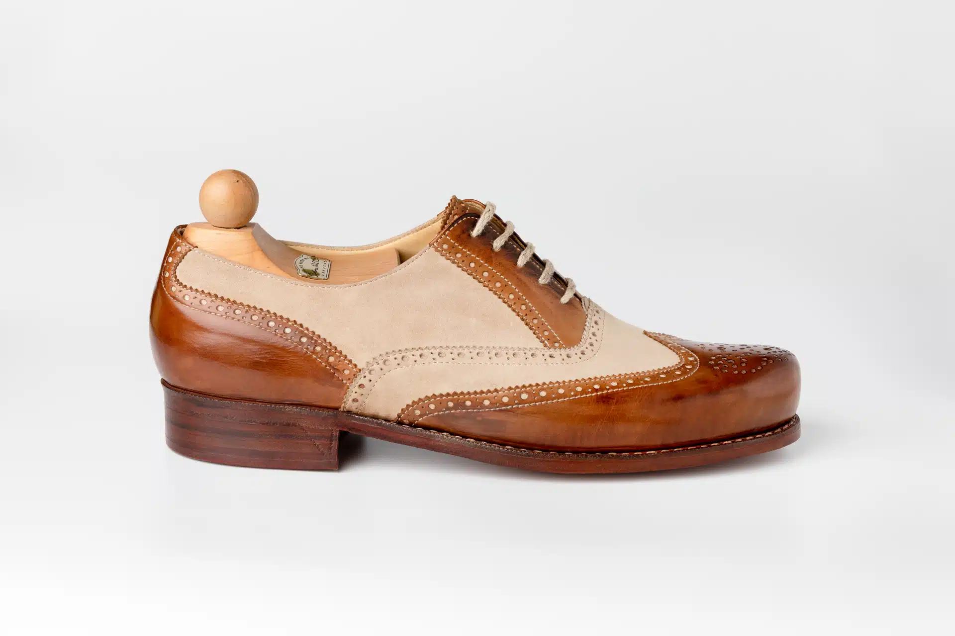 5 fűzőszemes, klasszikus full brogue oxford modell, borjúbox és velúr bőr kombináltan, rámán varrott talppal készítve. Akár egészen merész színösszeállítással is kitűnő választás lehet egy smart casual dress code rendezvényen, ahol viselője garantáltan kiemelkedne a konvencionálisabb cipőket viselők tömegéből.